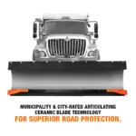 Its articulating plow blade helps protect road markers, manhole covers and other installations, while the ceramic inserts absorb impact into the rubber. It has been engineered to quietly plow dry road surfaces without jumping.